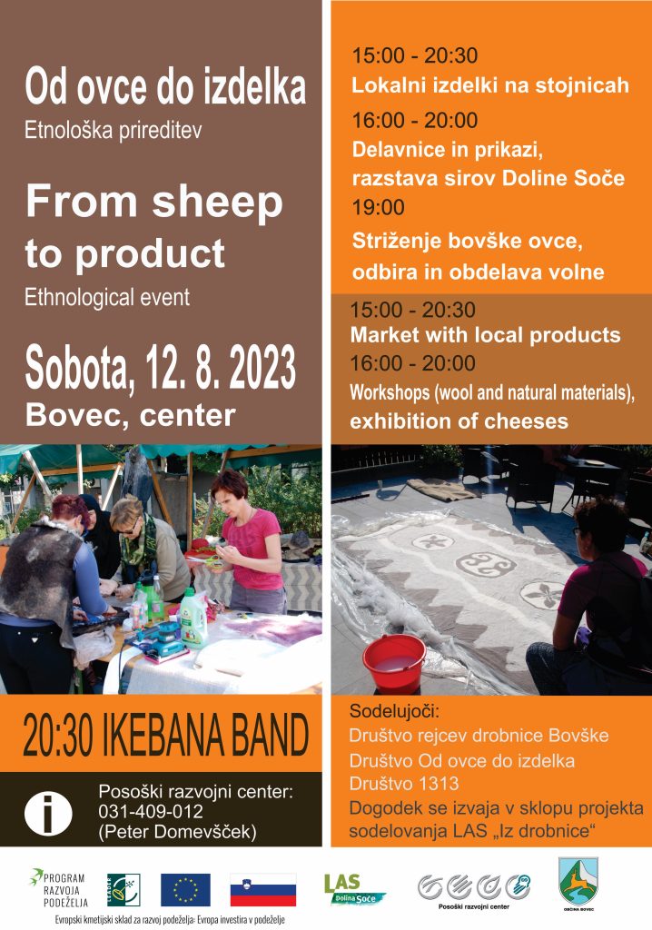 Lokalna akcijska skupina LAS Dolina Soče vas v soboto, 12. avgusta 2023, sodelovanju z Občino Bovec in Posoškim razvojni centrom vabi na etnološko prireditev Od ovce do izdelka.