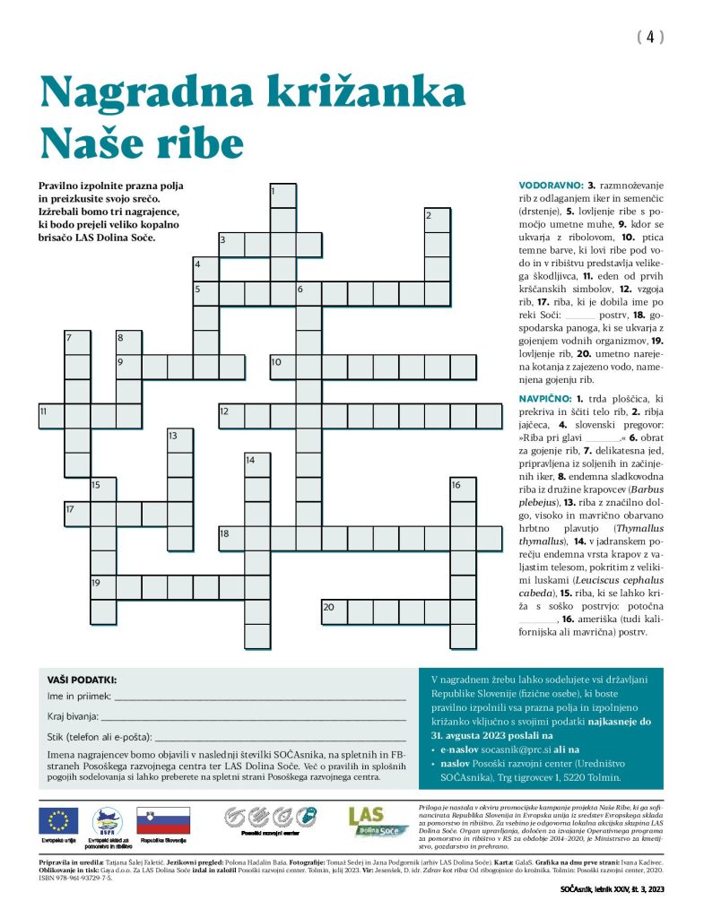 Organizator nagradnega žreba »Naše ribe« je LAS Dolina Soče, katerega vodilni partner je Posoški razvojni center (v nadaljevanju: organizator). V nagradni žreb se uvrstijo vsi, ki pravilno izpolnijo prazna polja križanke, ki je objavljena v SOČAsniku (letnik XXIII, št. 3/2023), na letaku, spletu in na socialnih omrežjih ter jo na Posoški razvojni center oddajo najkasneje do 31. avgusta 2023 do 24. ure. Nagradni žreb bo potekal 1. septembra 2023 na sedežu Posoškega razvojnega centra.