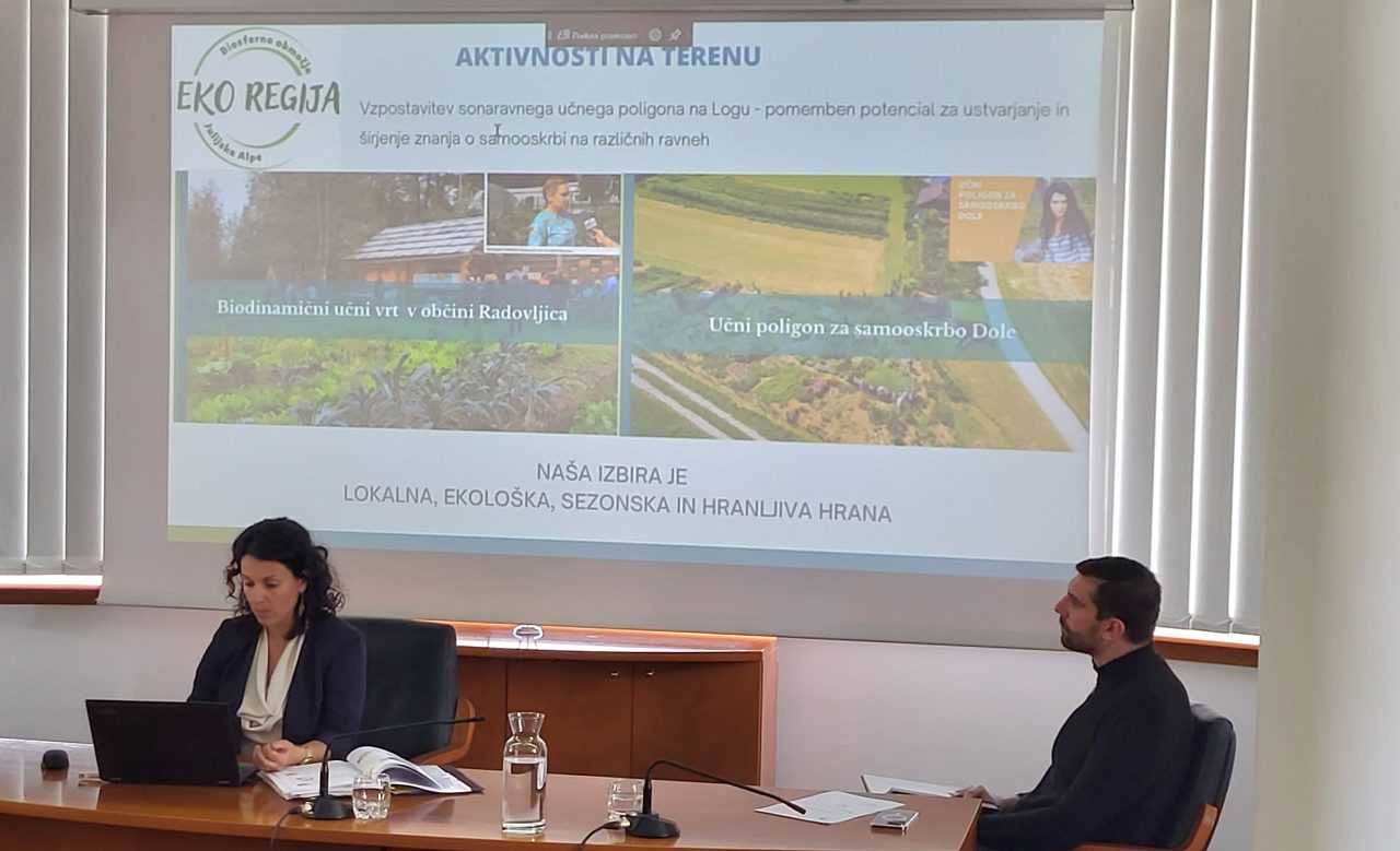 »Tu smo predvsem zato, da se iskreno pogovorimo o idejah, predlogih ali pripombah in da nastavimo smer v razvoju za naprej, glede na to, da je vse skupaj še vedno v začetni oziroma celo pilotni fazi,« je zbrane uvodoma nagovoril tolminski župan in nato besedo predal vodji projekta Vzpostavitev EKO regije v biosfernem območju Julijske Alpe (BO JA) Greti Černilogar iz Posoškega razvojnega centra (PRC), ki je v prvem delu predstavila omenjeni pilotni projekt. Ta po mnenju župana sodi med primere dobrih praks, saj »povezuje okolje, gospodarstvo in tudi socialno področje«, zato ga je tudi umestil na dnevni red. Černilogarjeva je v svoji predstavitvi med drugim poudarila naklonjenost in napovedano prednostno obravnavo ekološkega kmetijstva s strani Evropske unije. »Povezovanje z ekološkimi kmeti je zato nujno, če bomo želeli v našo dolino in regijo pritegniti nepovratna evropska sredstva,« je še dodala.