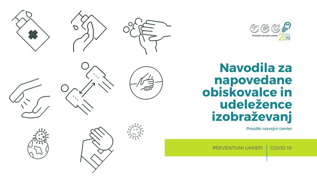 Obveščamo vas, da bo Posoški razvojni center, vodilni partner LAS Dolina Soče, v ponedeljek, 18. maja 2020, ponovno odprl svoja vrata za predhodno napovedane obiskovalce in udeležence izobraževanj in delavnic.V želji, da s skupnimi močmi omejimo oziroma zmanjšamo možnosti za širjenje okužbe s COVID-19, se je v ta namen pripravilo navodila oziroma seznam ukrepov, skladnih s priporočili Nacionalnega inštituta za javno zdravje.