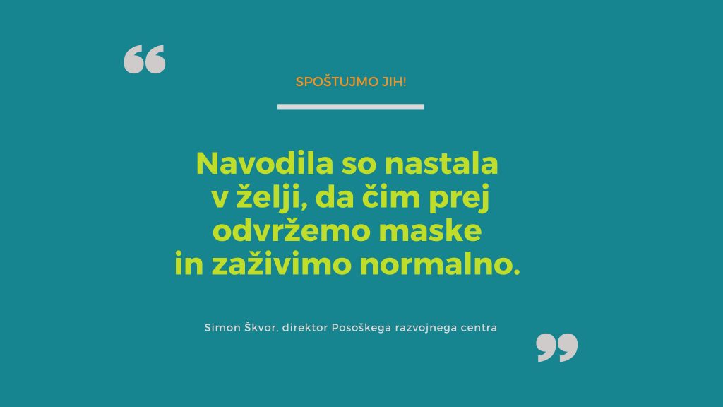 Kot je poudaril Simon Škvor, direktor Posoškega razvojnega centra, so navodila nastala “v želji, da čim prej odvržemo maske in zaživimo normalno.” Zato je prav, da jih spoštujemo!